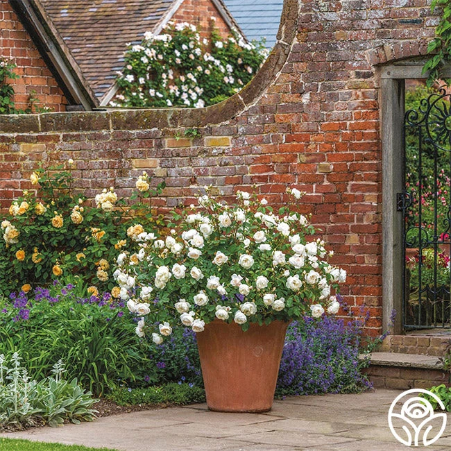 What sets this rose apart is its lovely fragrance. The strong Old Rose scent carries hints of almond blossom, cucumber, and lemon zest, making it a sensory delight. With its neat, rounded, and bushy shrub form, it’s a perfect choice for borders and hedges. Its compact size also makes it well-suited for containers, offering versatility in garden design.Â